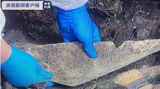 5月30日,三星堆遗址考古发掘现场3号坑成功提取青铜眼形器。青铜眼形器长53厘米、宽15厘米。平面呈三角形,中部有外鼓的眼珠。