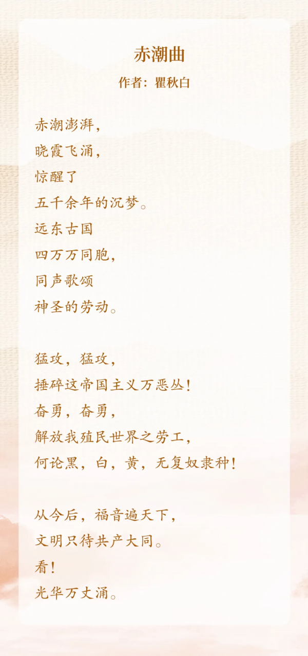 1917年,俄国十月革命一声炮响,为中国送来了马克思主义。青年瞿秋白开始投身革命洪流。五四运动后,他以记者身份赴苏俄实地采访,亲身感受到无产阶级革命的蓬勃伟力。1923年1月,瞿秋白回国。诗歌《赤潮曲》就创作于这个时期。