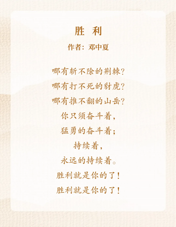 1923年,北洋政府直系军阀吴佩孚制造了“二七惨案”,此后,中国工人运动陷入低潮。为了鼓舞士气,中国共产党创建时期的重要领导人、中国工人运动的杰出领袖邓中夏在《中国青年》杂志第3期上发表了《胜利》这首诗,诗中洋溢着革命必胜的坚定信念。