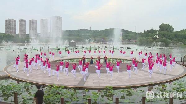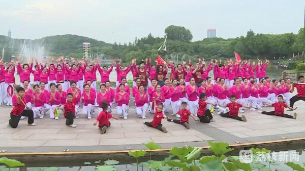 在市武术协会带来的武术表演《精忠报国》后,100名澄江街道广场舞爱好者以及4名歌手,在水上舞台与各乡镇(街道)共计万人的广场舞团队,在同一时刻同唱同跳《奋进新江阴》,活动氛围瞬间达到了高潮。