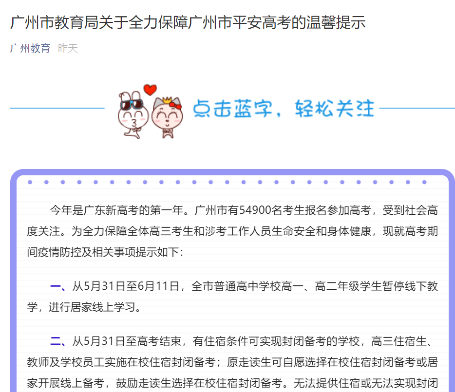 荔枝新闻讯 5月30日,广州市教育局发布《关于全力保障广州市平安高考的温馨提示》,全文如下: