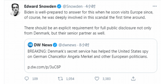 当地时间30日,美国前防务承包商雇员爱德华·斯诺登转发了德国之声的相关报道,并转推称:“拜登已经为其不久后的欧洲之行准备好回答这个问题,当然,他第一次就深深卷入了这桩丑闻。不仅是丹麦,他们的资深合伙伴也应该明确要求全面公开信息。”