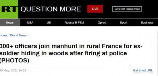 据“今日俄罗斯”(RT)、法新社报道,当地时间5月30日,法国一名退役军人向警察开枪后携枪逃跑,警方出动了近300名警力、7辆装甲车、7架直升机和一队警犬追捕。