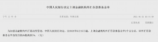 央行31日发布公告称,为加强金融机构外汇流动性管理,中国人民银行决定,自2021年6月15日起,上调金融机构外汇存款准备金率2个百分点,即外汇存款准备金率由现行的5%提高到7%。