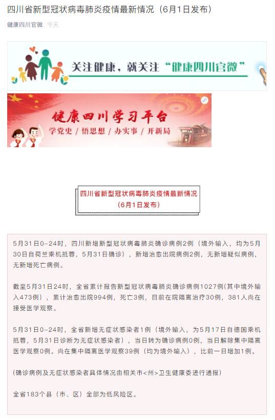 荔枝新闻讯 据四川省卫生和计划生育委员会微信公众号“健康四川官微”消息,5月31日0-24时,四川新增新型冠状病毒肺炎确诊病例2例(境外输入,均为5月30日自荷兰乘机抵蓉,5月31日确诊),新增治愈出院病例2例,无新增疑似病例,无新增死亡病例。