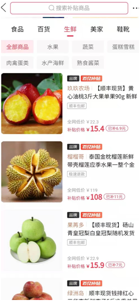 目前,面向水果生鲜、农副产品、肉禽蛋类等民生用品,“百亿补贴”已经实施常态化补贴。海南妃子笑荔枝、山东大樱桃、恩施小土豆等当季生鲜均得到5-20元(每斤)不等的补贴额度。除了当季生鲜,像泰国榴莲、山竹等进口热带水果,均被补贴到了同类最优价。