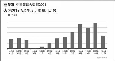 从2020年地方特色菜的订单量走势上看,2月订单量下降至低谷,5月恢复至新冠肺炎疫情前水平,并在10月到达峰值,同比增加172%。