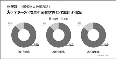 我国餐饮市场连锁化进程正在不断加快。报告显示,2018年中国餐饮市场连锁化率为12.8%,2019年增长至13.3%,2020年加速提升至15%。对比美国50%的餐饮连锁化率,中国餐饮连锁化仍具有非常广阔的增长空间。
