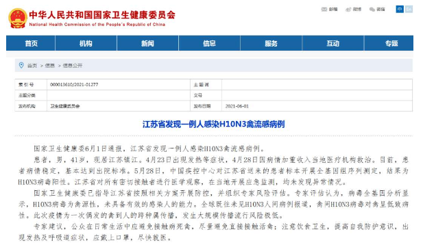 国家卫生健康委6月1日通报,江苏省发现一例人感染H10N3禽流感病例。