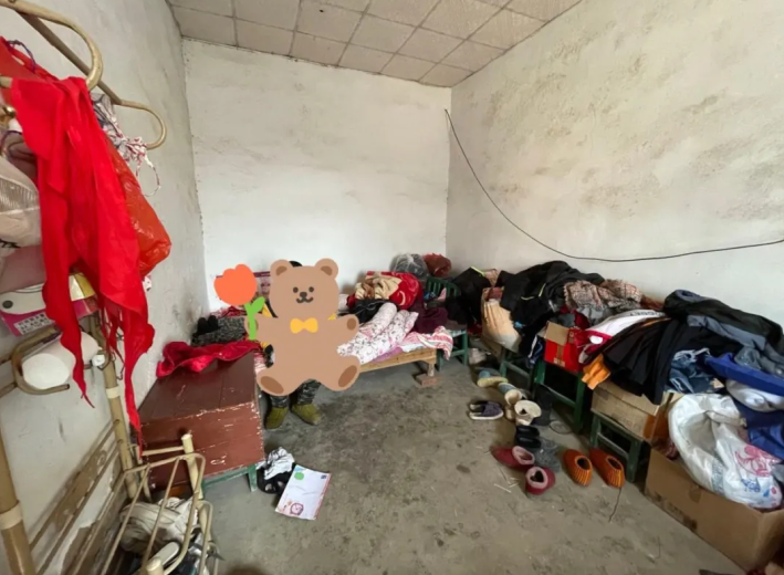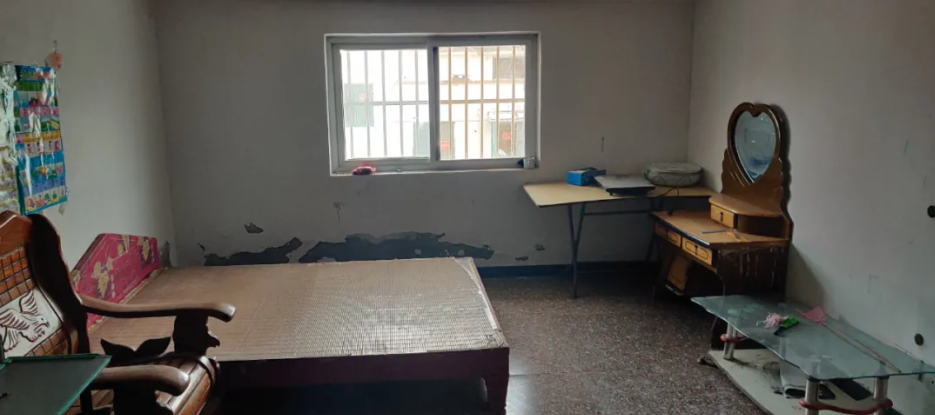 改造前的小屋,墙皮脱落,家具破旧,没有像样的书桌。