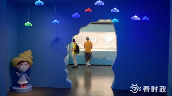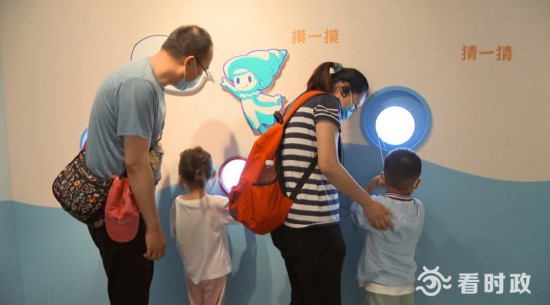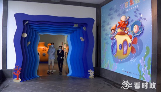 展览在视觉和语言策划中特别注重儿童元素的引入,将参观流程设计为一次潜水艇上的海底探索旅行。小朋友可在入口处领取纸制潜水艇登艇票,扫描背面的二维码进入互动答题环节,答案和知识点则散落在展厅各处,可在参观中寻找答案,寓教于乐的方式让参观体验更丰富。