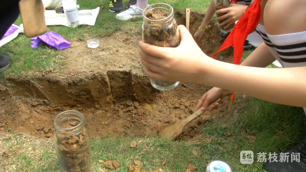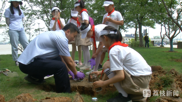 在环保专业人员的指导下,孩子们先后对水、空气、土壤标本进行采样,并封存在采集容器“江豚瓶”中,由专家带回实验室予以分析。