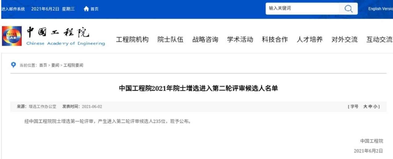 荔枝新闻讯 据中国工程院官网消息,今天(6月2日)公布2021年院士增选第二轮评审候选人名单,经中国工程院院士增选第一轮评审,产生进入第二轮评审候选人235位。