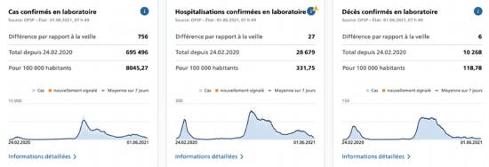 瑞士联邦卫生局最新数据显示,截至当地时间6月1日7时49分(北京时间6月1日13时49分),瑞士及列支敦士登公国新冠肺炎累计确诊病例695496例,相比前一天数据新增756例;新增死亡6例,累计死亡10268例;新增住院治疗27例,累计住院治疗28679例。