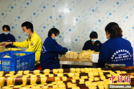 图为在江西省樟树市一家食品厂,工人正在包装腐竹。 吴鹏泉 摄