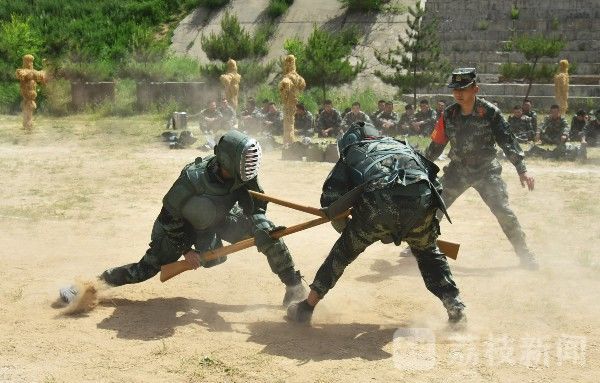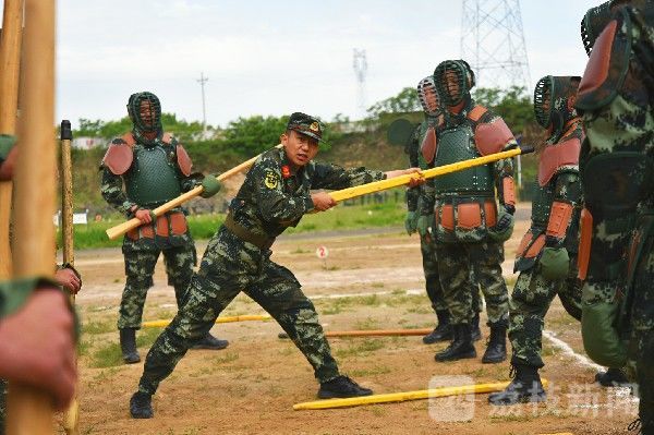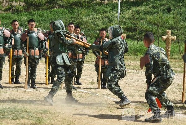 训练场上,官兵头戴护具、手握木抢,随着指挥员的口令,震天的喊杀声和木抢的撞击声此起彼伏。