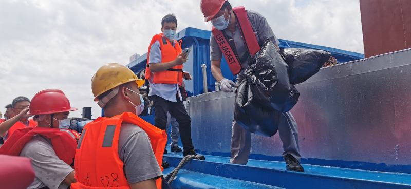 上午,工作人员前往过驳锚地水域,开展垃圾和生活污水接收工作。接受清运的是一艘重庆籍货船,只见工作人员将抽水管接入货船,船内生活污水被快速抽出,排入接收船上的专用接收柜。随后,一包包生活垃圾也由工作人员从货船取出,按照垃圾分类原则被放置到清运艇的垃圾存放区。货运船船长孙发兵告诉记者:“之前垃圾在船上放久了有臭味,都是蚊虫,现在天天有船来收掉了,方便多了,也卫生些。”