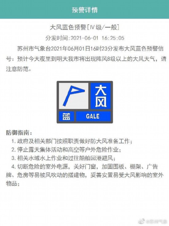 昨天16时23分,苏州市气象台发布大风蓝色预警信号。
