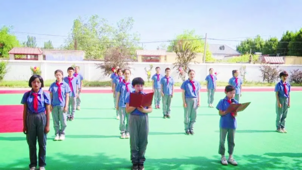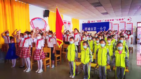 塔城市第一小学举行了“红色旗帜 代代相传”庆“六一”活动,60名新入队的少先队员佩戴上了鲜艳的红领巾。