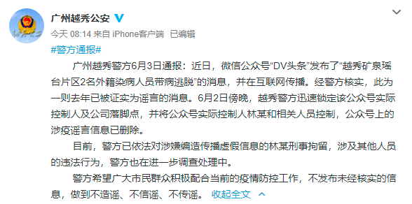 荔枝新闻讯 广州越秀警方3日通报:近日,微信公众号“DV头条”发布了“越秀矿泉瑶台片区2名外籍染病人员带病逃脱”的消息,并在互联网传播。经警方核实,此为一则去年已被证实为谣言的消息。6月2日傍晚,越秀警方迅速锁定该公众号实际控制人及公司落脚点,并将公众号实际控制人林某和相关人员控制,公众号上的涉疫谣言信息已删除。