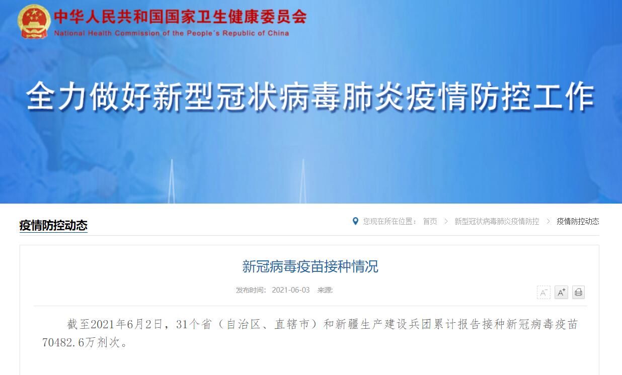 国家卫健委网站6月3日消息,截至2021年6月2日,31个省(自治区、直辖市)和新疆生产建设兵团累计报告接种新冠病毒疫苗70482.6万剂次。