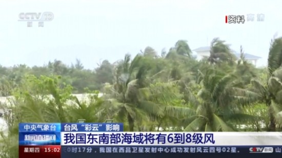 据中央气象台监测,今年第3号台风“彩云”的中心,今天11点位于南海中东部海面上,距离台湾省鹅銮鼻南偏西方约580公里,中心附近最大风力8级,属于热带风暴级。台风“彩云”将以每小时20-25公里的速度向偏北方向移动,强度变化不大。