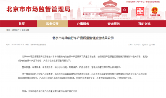 北京市市场监督管理局表示,对于抽查发现的不合格产品销售者已依法进行处理。北京市市场监督管理局提示消费者,购买电动自行车产品时应查验CCC强制性认证标识,产品应已被纳入北京市电动自行车目录。为保护自身驾驶安全,不要改装电动自行车,不要在室内充电。