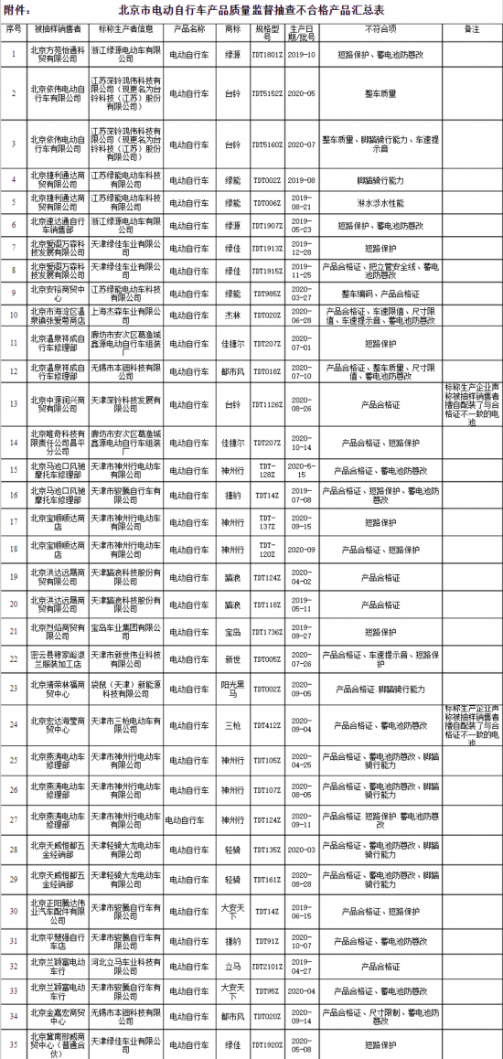 中国网财经6月3日讯 据北京市市场监督管理局网站消息,近日,北京市市场监督管理局近期依法对本市销售的电动自行车产品开展了质量监督抽查,按照相应产品质量监督抽查实施细则和相关标准,发现35组电动自行车产品不合格,涉及绿源、台铃、绿能、宝岛等品牌。产品存在的主要质量问题有:整车质量,车速限值,车速提示音,淋水涉水性能,短路保护,产品合格证,蓄电池防篡改等不符合标准要求。