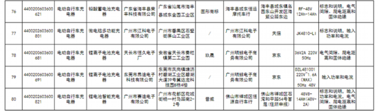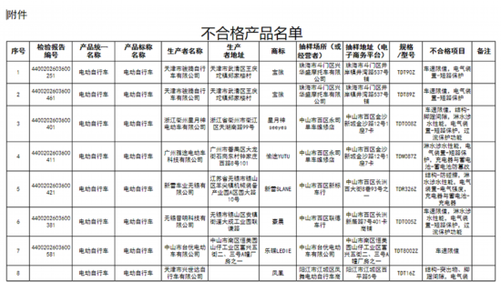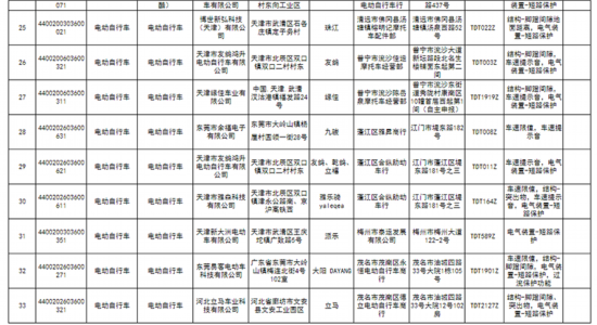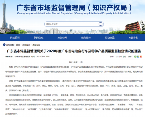 中国网财经6月3日讯 据广东省市场监督管理局网站消息,近日,广东省市场监督管理局发布2020年度广东省电动自行车及零件产品质量监督抽查情况的通告。通告显示,本次共对141家企业生产的电动自行车、电动自行车充电器等2类230款电动自行车及零件产品质量开展了监督抽查。经检验,发现62家企业生产的80款产品不合格,涉及大阳、新蕾、净原、鳯凰PHOENIX、新日等品牌。不合格项目主要有:“车速限值”“结构”“车速提示音”“淋水涉水性能”“电气装置”“过流保护功能”“充电器与蓄电池”“标志和说明”“输入功率和电流”“电气间隙、爬电距离和固体绝缘”等。