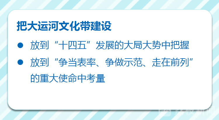 会议观看了省大运河文化带建设纪实专题片,听取了省大运河文化带和国家文化公园建设等有关情况汇报,讨论了省大运河文化保护传承利用实施规划、国家文化公园建设保护规划等,研究部署了“十四五”和下阶段工作重点。