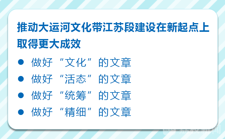 会议指出,推动大运河文化带江苏段建设在新起点上取得更大成效,要做好“文化”的文章,抓住“文化”这条主线、这个灵魂,立足高品位、突出特色化,以文化遗产为载体,以大运河承载的文化价值和精神内涵为核心,把大运河文化特质与地方文化特色统一起来,结合党史学习教育充分挖掘传承运河沿线丰富的红色资源,精心打造独具韵味、各美其美的文化长廊。要做好“活态”的文章,在规划方面树牢活态保护、活态传承、活态利用理念,在建设方面真正做到发展中保护、保护中发展,在管理方面坚持把绿色理念、现代技术、文化元素贯穿到大运河治理全过程、各方面,让古老运河在新时代焕发出新活力。要做好“统筹”的文章,更加注重把握规律,运用系统思维,整体谋划推进,切实把大运河文化遗产保护同生态环境保护提升、沿线名城名镇保护修复、文化旅游融合发展、运河航运转型提升统一起来,把推进南水北调东线工程高质量发展与大运河文化带建设协同起来。要做好“精细”的文章,把精品意识融入每一个工程、每一个项目、每一段河道、每一处风貌,像绣花一样一针一线去绣,每一针都要见功夫、见品质;大运河国家文化公园建设要坚持世界眼光、中国气派、江苏特色,既浓墨重彩、高质量打造标识工程,又工笔绘就、精致建设一批核心展示园、集中展示带、特色展示点和运河文化空间,把每个项目都建成精品工程、经典工程。