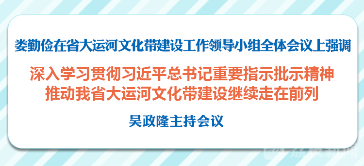 荔枝新闻讯 6月3日,省大运河文化带建设工作领导小组举行全体会议。省委书记、省大运河文化带建设工作领导小组组长娄勤俭在讲话中强调,要深入学习贯彻习近平总书记关于大运河文化保护传承利用的重要指示批示精神,立足新发展阶段、贯彻新发展理念、构建新发展格局,对照“争当表率、争做示范、走在前列”的使命要求,以更高标准、更高水平、更富成效的工作,推动我省大运河文化带建设继续走在前列。省长、省大运河文化带建设工作领导小组第一副组长吴政隆主持会议。