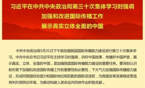 三寸之舌,强于百万雄兵;一人之辩,重于九鼎之宝。中共中央政治局5月31日下午就加强我国国际传播能力建设进行第三十次集体学习。中共中央总书记习近平在主持学习时强调,讲好中国故事,传播好中国声音,展示真实、立体、全面的中国。改革开放四十多年以来,随着我国对外开放的大门不断敞开,涉外经贸科教人文交流日益频繁,这也在一定程度上加剧了国家之间意识形态领域的碰撞激荡。特别是在当前世界百年未有之大变局的时代背景下,立足于新发展阶段,如何把中国特色社会主义的制度优势运用国际化平台广泛传播、出圈出彩,这是摆在中国人民面前的一道附加“思考题”。