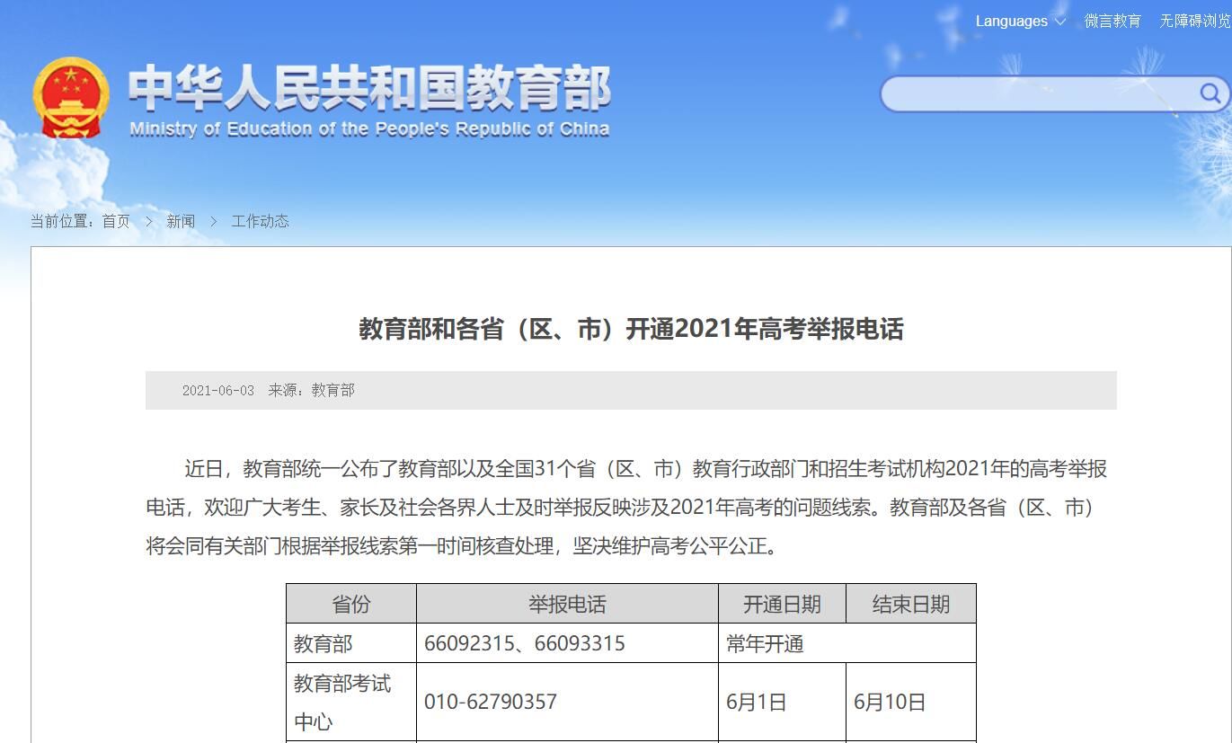 据教育部网站消息,近日,教育部统一公布了教育部以及全国31个省(区、市)教育行政部门和招生考试机构2021年的高考举报电话,欢迎广大考生、家长及社会各界人士及时举报反映涉及2021年高考的问题线索。教育部及各省(区、市)将会同有关部门根据举报线索第一时间核查处理,坚决维护高考公平公正。