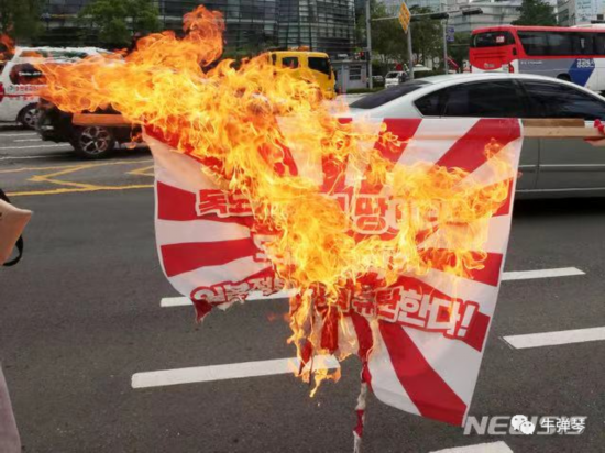 性格火爆的韩国年轻人,更是连续多天闯到日本使领馆前,焚烧日本“旭日旗”,发泄心中不满。