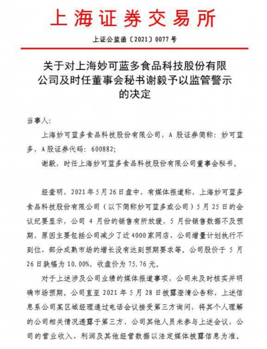 监管警示决定显示,当事人:上海妙可蓝多食品科技股份有限公司;谢毅,时任上海妙可蓝多食品科技股份有限公司董事会秘书。