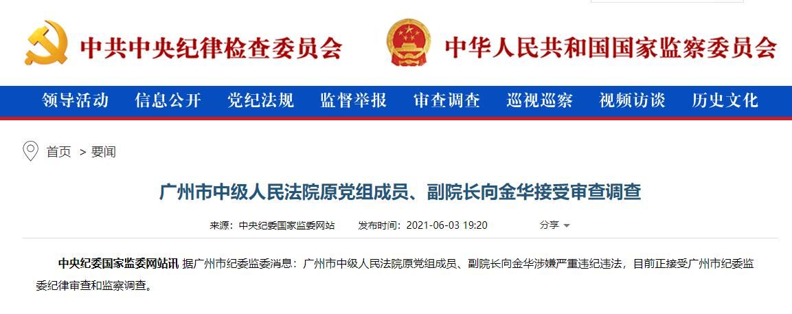 中央纪委国家监委网站讯 据广州市纪委监委消息:广州市中级人民法院原党组成员、副院长向金华涉嫌严重违纪违法,目前正接受广州市纪委监委纪律审查和监察调查。
