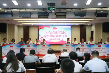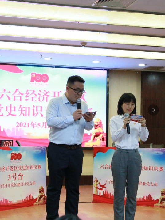 荔枝新闻讯 “2020年11月14日,习近平总书记视察江苏,要求江苏认真贯彻落实十九届五中全会精神,全面把握新发展阶段的新任务新要求……”主持人话音刚落,抢答器纷纷响起,六合经济开发区结合园区党史学习教育工作部署,5月29日下午举办了“学习百年党史,奋进园区新征程”党史知识竞赛决赛。来自机关6家党支部的12名党员代表齐聚一堂,以竞赛的形式回首党的百年奋斗历程、检验党史理论学习掌握情况,引导和督促机关党员学好党史这门必修课。