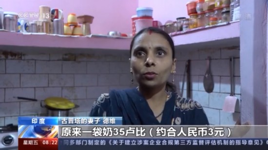 古普塔的妻子 德维:原来一袋奶35卢比(约合人民币3元)现在涨到55到60卢比了(约合人民币4.8元到5.3元)。蔬菜和水果的价格也在飞涨,所以我们只能一分钱掰成两半花。