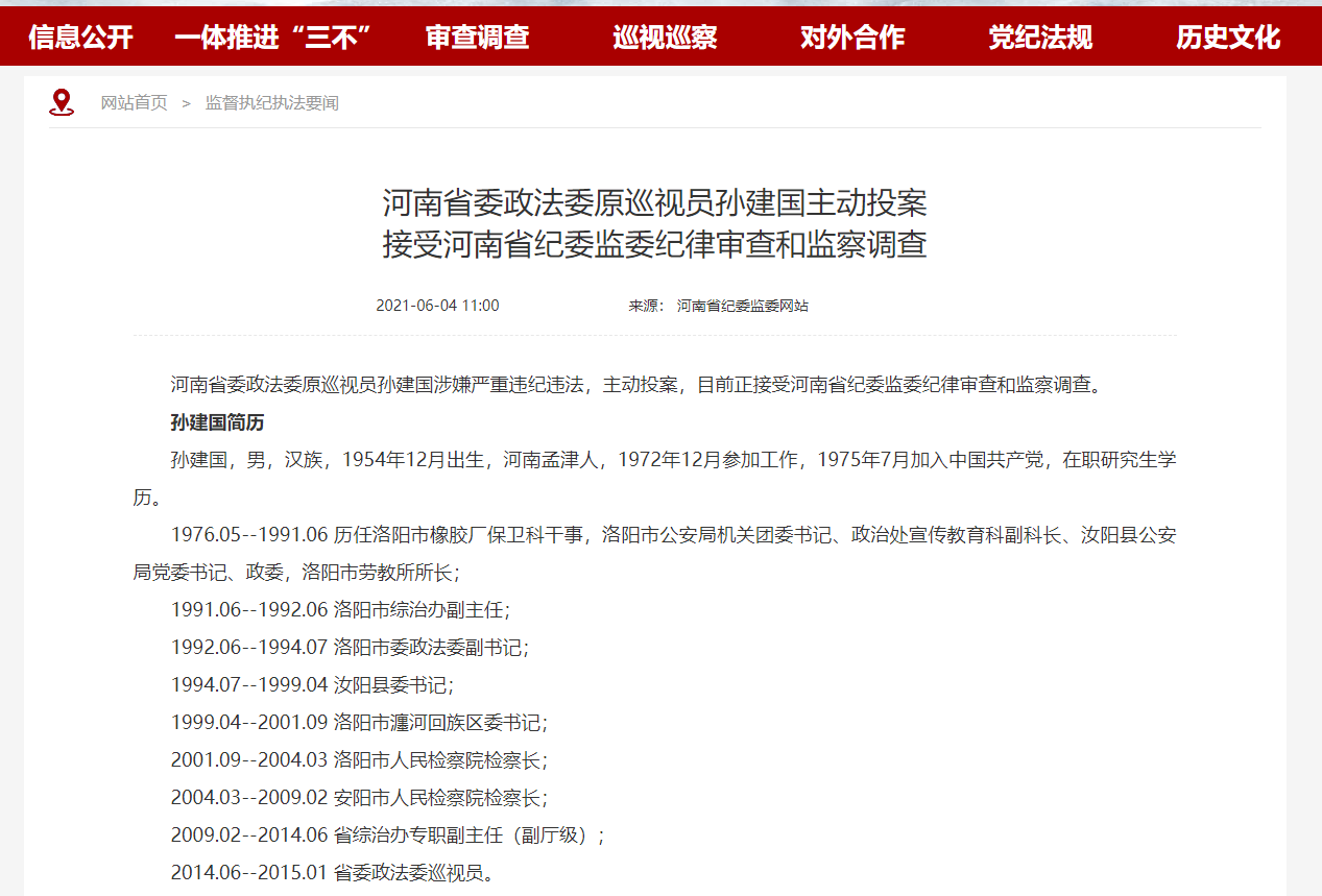 荔枝新闻讯 据河南省纪委监委网站消息,河南省委政法委原巡视员孙建国涉嫌严重违纪违法,主动投案,目前正接受河南省纪委监委纪律审查和监察调查。