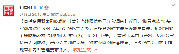 荔枝新闻讯 据“扫黄打非”微博通报,近日,“断鼻家族”15头亚洲象途径过的玉溪市红塔区洛河乡,有多名网络主播在该地点直播。针对“网络主播吃播象群吃剩的菠萝”的行为,6月2日下午,云南省玉溪市互联网信息办公室负责人回应称,已经关注到该现象,对这类网络低俗现象,正按照该部门的工作规章和内容管理要求介入。
