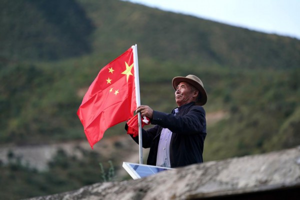 2020年9月25日,在西藏昌都市江达县岗托村,普巴在屋顶上换上崭新的国旗。新华社记者 詹彦 摄