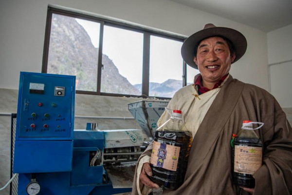 2021年3月23日,在昌都市江达县岗托镇岗托村的清油加工厂,永红在展示清油产品。新华社记者 孙非 摄