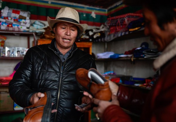 2018年3月15日,西藏阿里地区改则县物玛乡抢古村村民阿祖(左)在合作社商店内销售皮鞋。新华社发 刘东君 摄