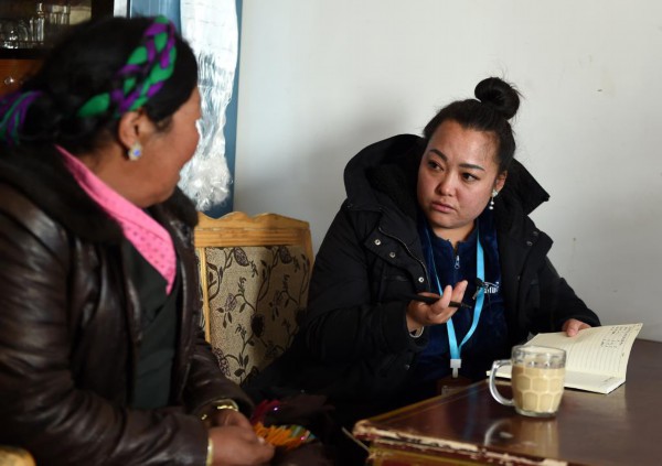 2018年3月6日,拉萨市曲水县委宣传部副部长、才纳乡四季吉祥村党支部第一书记索朗央吉(右)与村民商量编制规划。新华社记者 觉果 摄