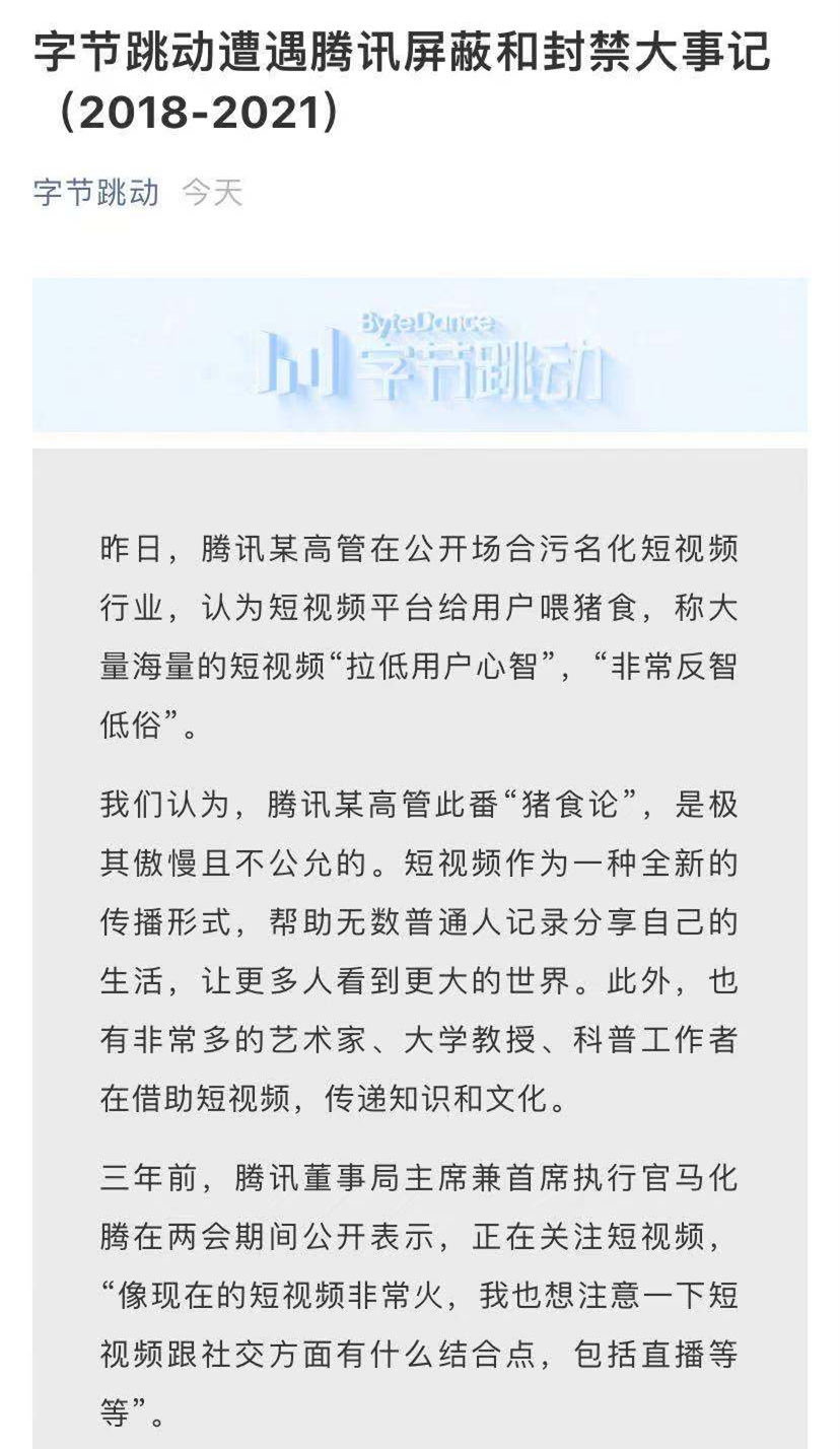 荔枝新闻讯 字节跳动微信公众号消息,6月4日,字节跳动在微信公众号发布文章,列举2018-2021年被腾讯屏蔽案例,称腾讯某高管在公开场合污名化短视频行业,认为短视频平台给用户喂猪食,称大量海量的短视频“拉低用户心智”,“非常反智低俗”。字节跳动还指出,腾讯还以各种方式屏蔽、封禁、污名化短视频同行,对字节跳动旗下抖音、火山小视频、西瓜视频封禁持续三年,波及用户总量超10亿。直到现在,由于微信的封禁,每天仍有超过4900万人次主动分享抖音至微信/QQ时受阻。