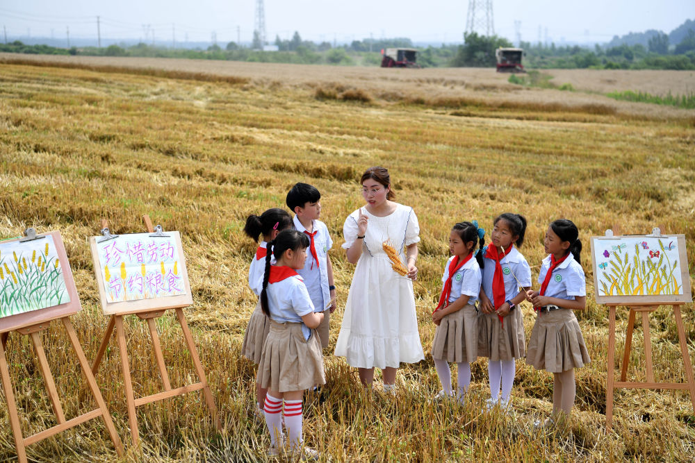 6月1日,安徽省合肥市小庙中心学校学生在蜀山区小庙镇段冲村的麦田里开展“节约粮食”主题活动。(新华社记者刘军喜摄)