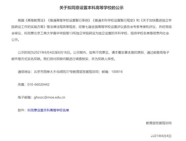 根据《高等教育法》《普通高等学校设置暂行条例》《普通本科学校设置暂行规定》和《关于加快推进独立学院转设工作的实施方案》等法律法规政策规定,经第七届全国高等学校设置评议委员会专家考察和评议,并经党组会审议,教育部拟同意北京工商大学嘉华学院等13所独立学院转设为独立设置的本科学校,现将学校名单等信息向社会公示。