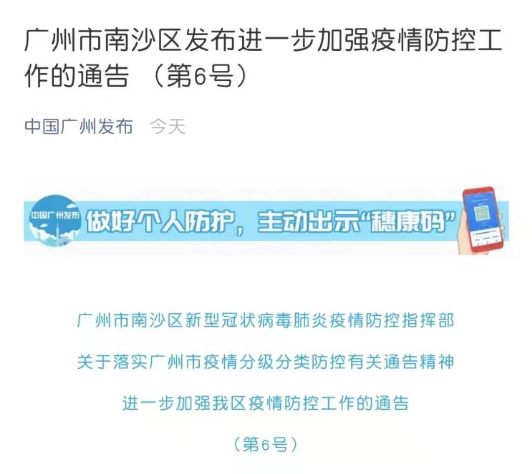 广州市南沙区于6月5日至6月6日对全区户籍人口、来穗人员就地开展全员核酸检测工作。