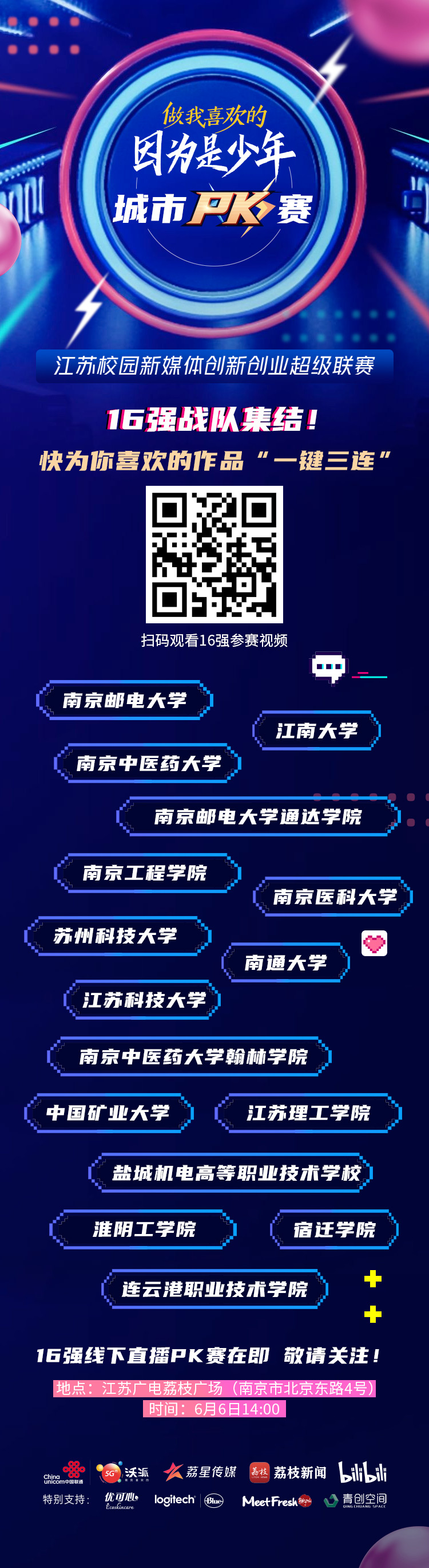 关注哔哩哔哩“因为是少年超级联赛”账号,即可观看大赛相关优秀视频与活动实况;搜索#做我喜欢的·城市PK赛#活动标签或直接扫码↓,为你pick的参赛队伍“一键三连”,助他们C位出道! 还等什么,快来为少年们助力吧!